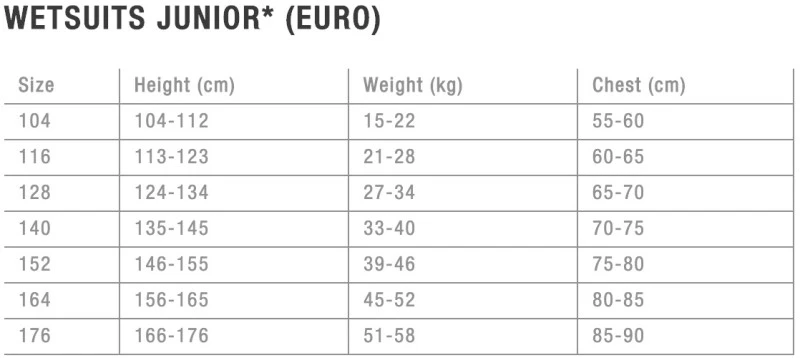 Größentabelle / Size Chart ION Capture Semidry 4/3mm BZ Backzip 2022 Kinderneopren Rückenreißverschluß