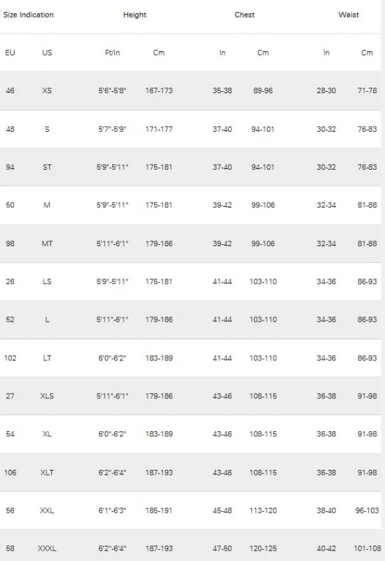 | 27 | XLS | 5’11“-6’1″ | 179-186 | 43-46 | 108-115 | 36-38 | 91-98 | |||