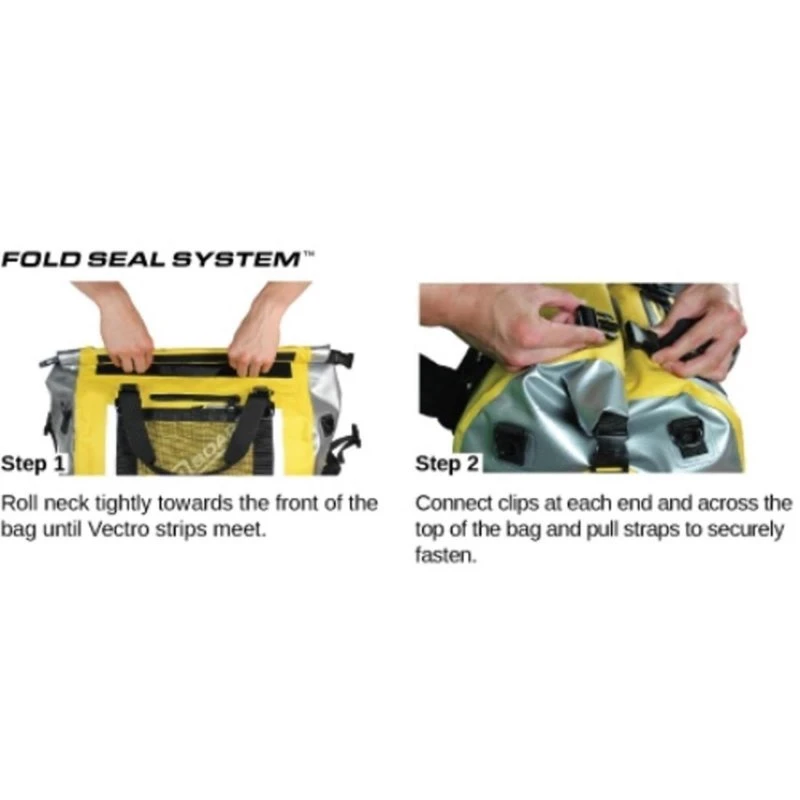 Die Roll-Top-Tasche verfügt über eine große Öffnung, um den Zugang zu erleichtern. An der Außenseite gibt es eine große Netztasche mit Klettverschluss und eine weitere Tasche mit wasserdichtem Reissverschluss. Innen gibt es eine Nass-/Trockentasche mit Reißverschluss.