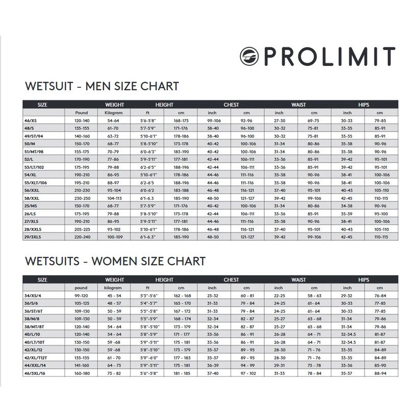 Größentabelle / Size Chart Prolimit Edge 5/3 navy/blue Damenneoprenanzug