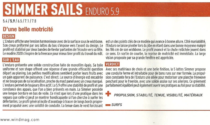 Unsere Testzusammenfassung: Laut des Testberichts des frz. Windmags in o. g. Ausgabe ist das Simmer Enduro 2020 innnerhalb der Segelgruppe der Freemovesegel eher leistungs-/freerideorientiert. Das ganze selbstverständlich bei Simmer typischer Topqualität in Material, Ausstattung und Verarbeitung! Der komplette Testbericht: siehe Bild 4.