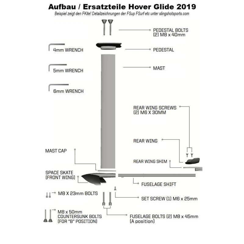 Der Tuttle Connector verfügt über ein massives M10 Gewinde um ihn mit dem Board zu verbinden. Falls ein bestehendes Windsurf Brett (nicht Slingshot) mit M6 Tuttle Box Schrauben genutzt werden soll, kann ein M10-M6 Adapterset (Bolt Adapter) dazugekauft werden, die es ermöglichen das Board und den Connector mit M6 Schrauben zu verbinden.